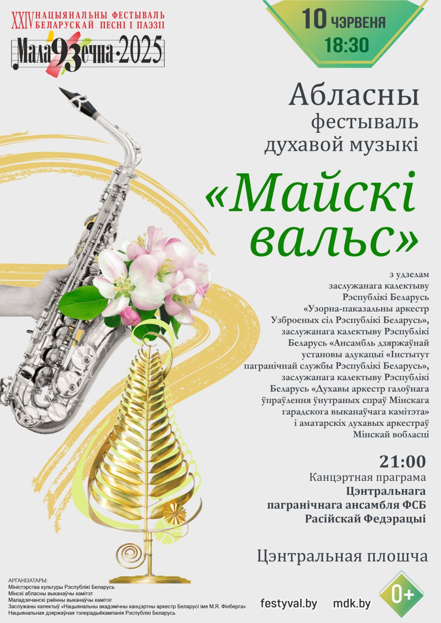 Старт насыщенной программе XXIV Национального фестиваля белорусской песни и поэзии «МАЛАДЗЕЧНА – 2025» даст Областной фестиваль духовой музыки «Майскі вальс», который состоится 10 июня в самом сердце Молодечно – на Центральной площади. Это событие станет ярким прологом фестиваля, подарив жителям и гостям города возможность насладиться мастерством ведущих духовых коллективов страны. Среди участников заявлены: