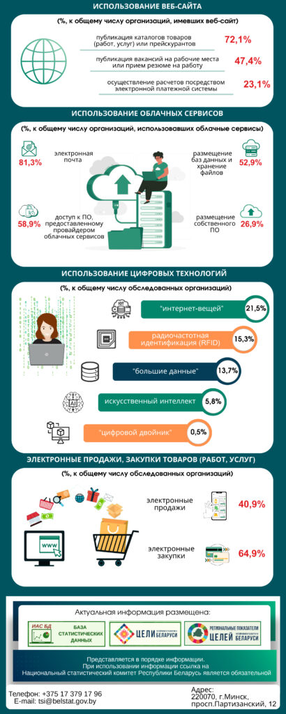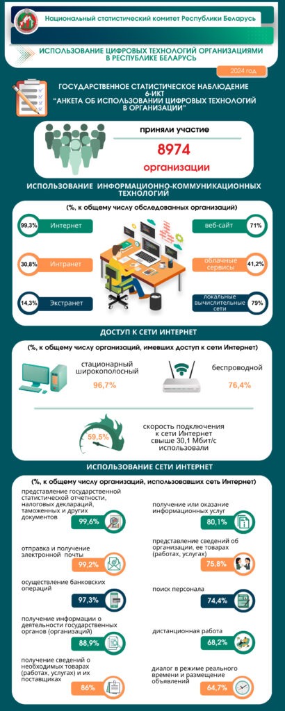 Проведенное обследование показало, что организации в своей работе активно применяют информационно-коммуникационные технологии. Так, сеть Интернет использовали 99,3% организаций, локальные вычислительные сети – 79%, Интранет – 30,8%, Экстранет – 14,3%. Более половины организаций (60,8%) предоставляли своим работникам технические средства (смартфоны, планшетные компьютеры и другие), обеспечивающие беспроводной (мобильный) доступ к сети Интернет.