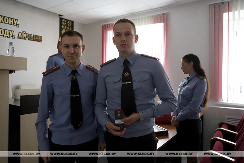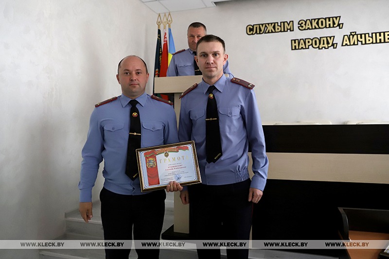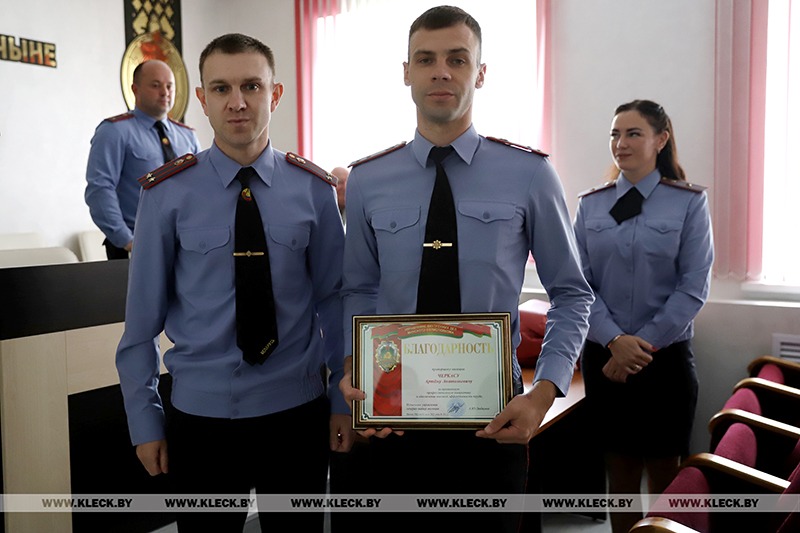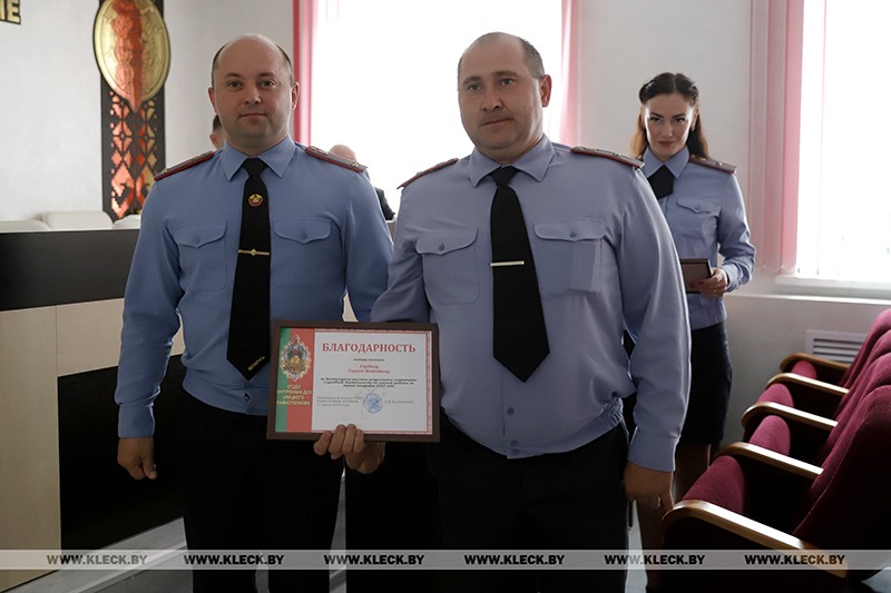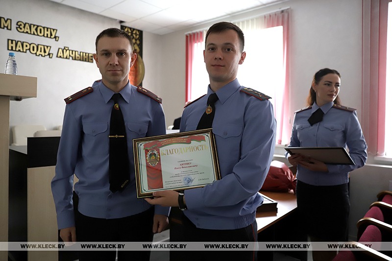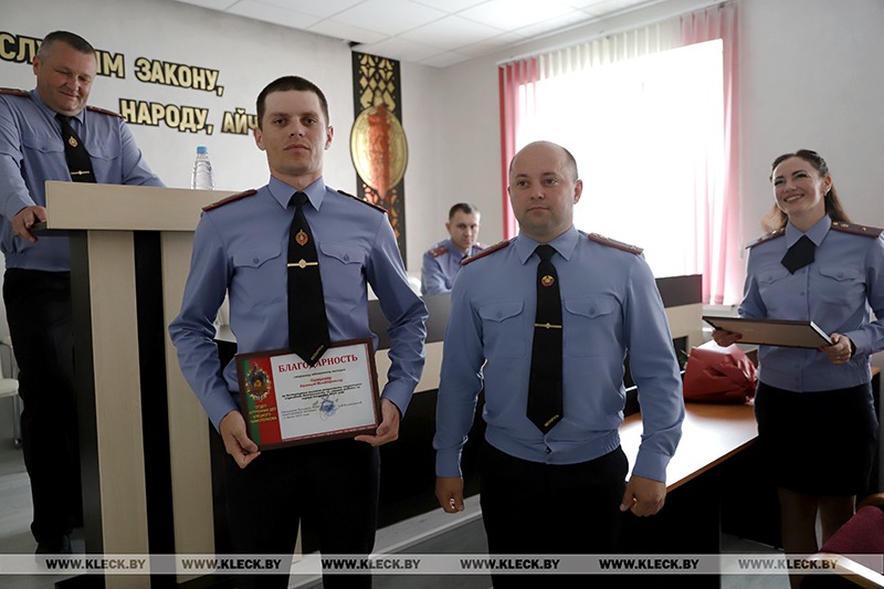 Так, благодарностью заместителя Министра внутренних дел отмечена старший инспектор группы кадров Виктория Масько; очередное специальное звание «капитан милиции» присвоено участковому инспектору ИДН Роману Семенову; грамотой УВД Миноблиспокома награжден начальник Клецкого РОВД Александр Кулаковский; благодарностью начальника УВД – оперуполномоченный отделения уголовного розыска Павел Хитрик и водитель оперативно-дежурной службы Артем Черкас.