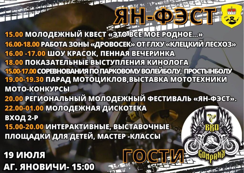 Афиша регионального молодежного фестиваля “ЯН-ФЭСТ” Актуально Культура Да новых перамог, Клецк, Новости Клецка ДНП 15.07.2025 0 Комментарии В агрогородке Яновичи Клецкого района в эту субботу 19 июля пройдет региональный молодежный фестиваль.