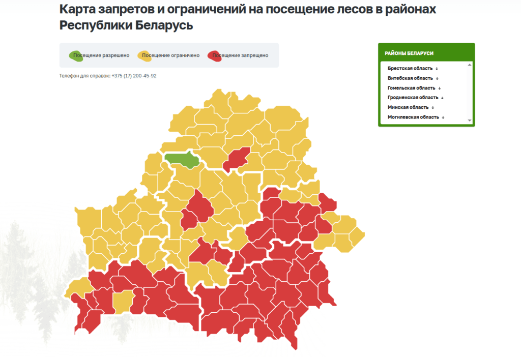 Запрет на посещение лесов во всех районах введен в Гомельской области. В Брестской области запрет действует во всех районах, кроме Каменецкого, Дрогичинского, Барановичского и Ляховичского районов – здесь введено ограничение на посещение. В Гродненской области во всех районах действует ограничение на посещение лесов.