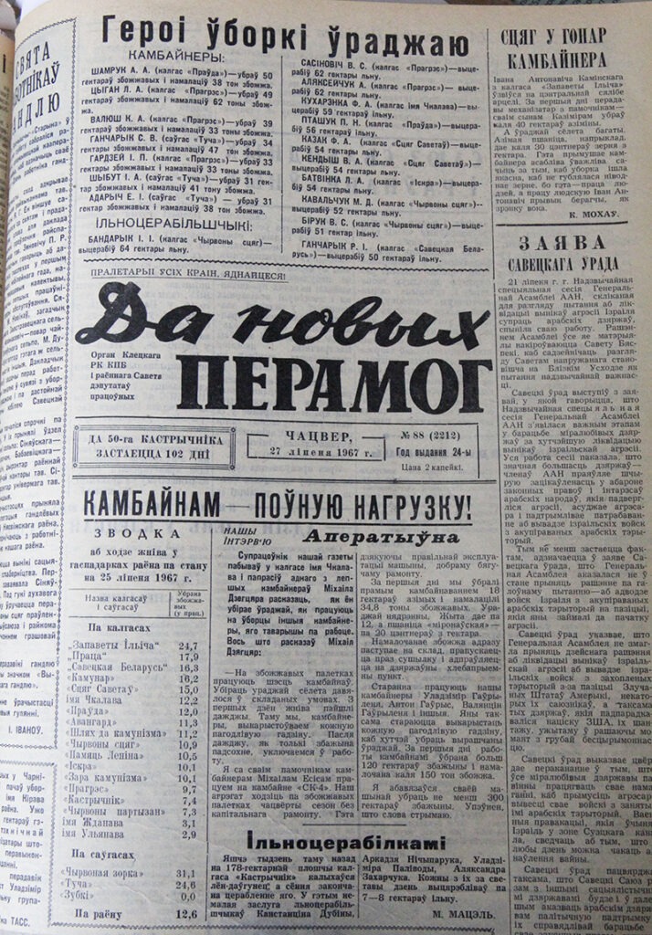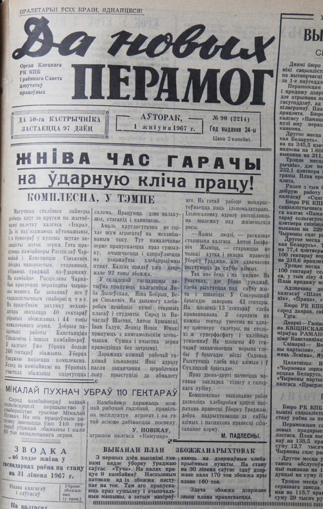 З вялікай цікавасцю чытачы раёнкі сачылі за тэмпамі жніва і яго лідарамі. На першай старонцы вялікімі літарамі зверху друкаваліся імёны герояў уборкі ўраджаю. Імі ганарыліся, іх ставілі ў прыклад, за лідарамі цягнулася моладзь.