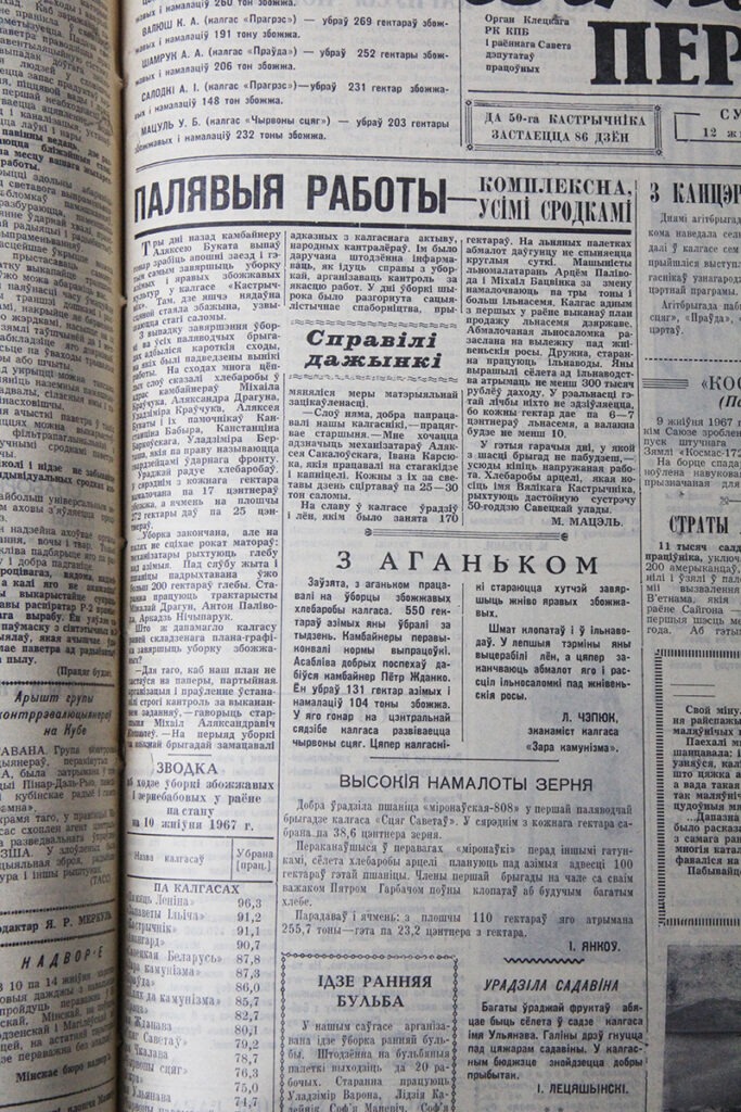 Адразу прыцягнула ўвагу газета за 13 ліпеня 1967 года з матэрыялам «Рабочы план уборкі ўраджаю бягучага года ў сельгасарцелі «Іскра». З тэксту зразумела, што калгаснікам патрэбна ўбраць 142 га льну, 640 га азімых і 360 га яравых збожжавых. Ні ў якае параўнанне з сённяшняй тэхнікай не ідзе тая, на якой самааддана працавалі аграрыі 60х: камбайны СК3 і СК4, аўтамашыны ГАЗ51, МТЗ са стагакідальнікамі, Т74 з валакушамі. Пагадзіцеся, што зараз інакш як гераічнай працу аграрыяў таго часу назваць нельга.