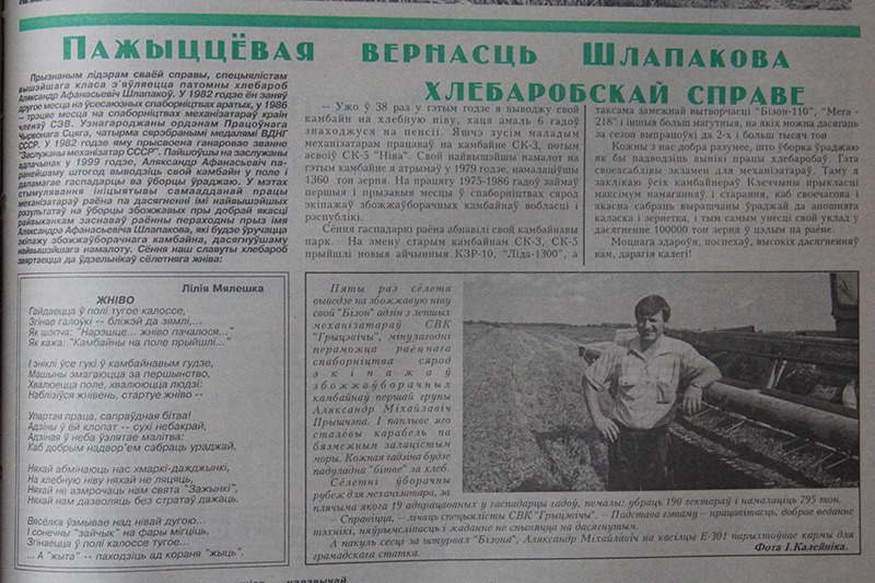 Так, ён – Аляксандр Апанасавіч Шлапакоў – прызнаны лідар хлебаробскай справы, спецыяліст вышэйшага класа. У 1982 годзе заняў другое месца на ўсесаюзных спаборніцтвах аратых, а ў 1986 годзе ўзяў трэцяе месца на спаборніцтвах механізатараў краін членаў СЭВ.