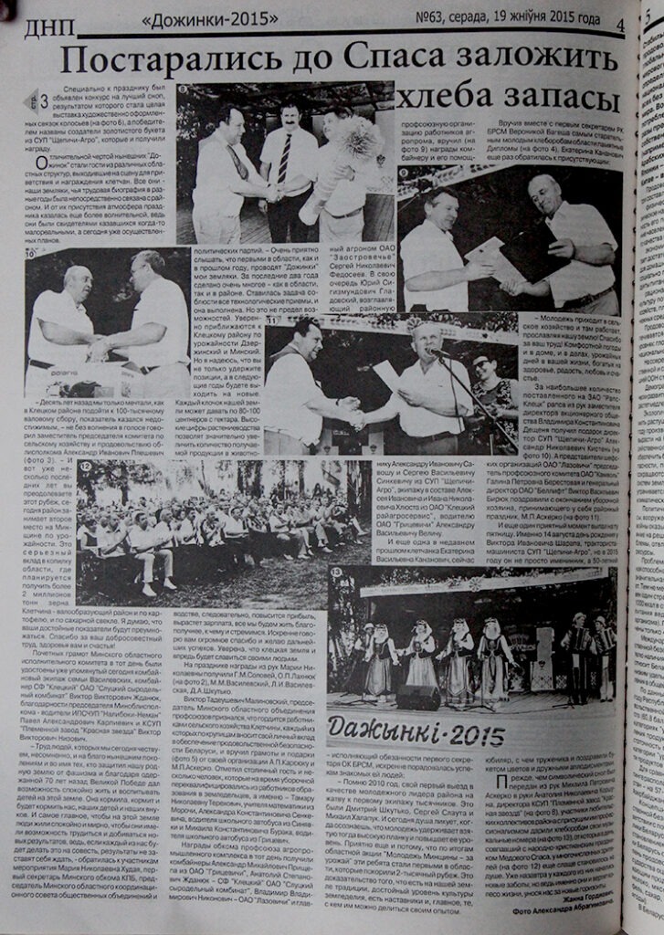 Што тычыцца «Дажынак», то аб іх надрукавана ў газеце за 12 жніўня аб першынстве камбайнераў калгаса «Кастрычнік» – сціпла, хоць і на першай старонцы, але без фотаздымкаў.