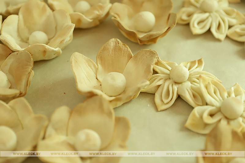 Каравай этого года украсили десятками цветов из муки различного дизайна, а также съедобными листьями и колосками.