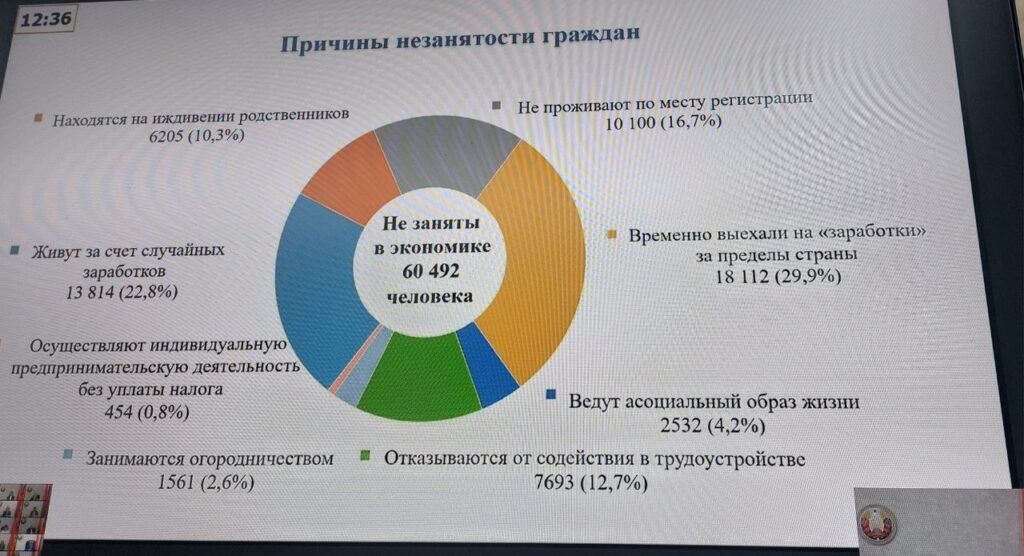 Детально проанализировала состояние занятости населения в республике и в Минской области Тамара Красовская, председатель комитета по труду, занятости и социальной защите облисполкома. Тамара Петровна обратила внимание на то, что в базе данных незанятых в экономике страны сейчас числятся 103,3 тысяч человек, из них 60,3 тыс. – мужчины, и 43 тыс. человек – женщины трудоспособного возраста.