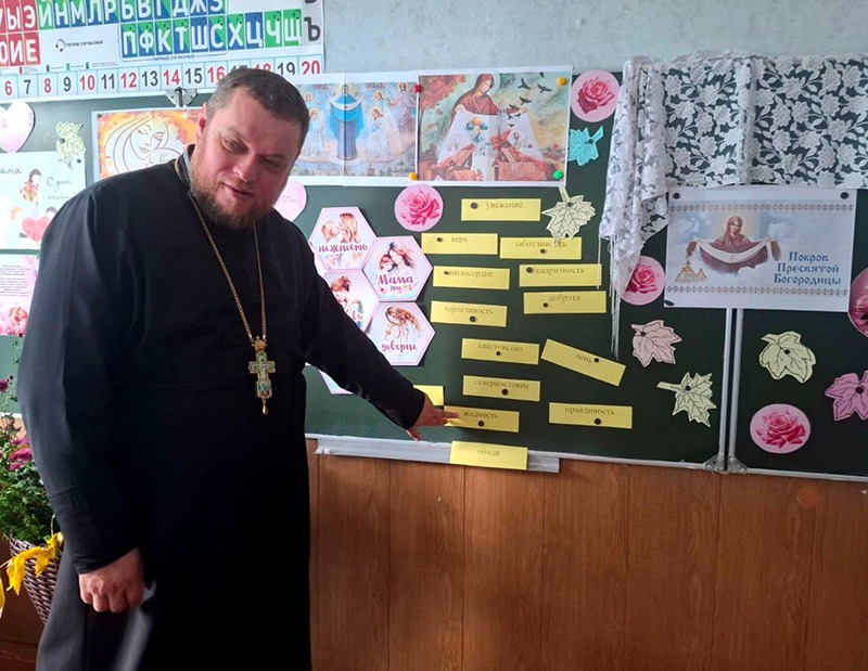 В рамках Недели родительской любви, которая в нашей стране проходит в период времени с 14 по 21 октября, в Клецкой средней школе №3 прошло открытое факультативное занятие по основам православной культуры на тему «Покров Пресвятой Богородицы». На встречу с ребятами пришел благочинный Клецкого церковного округа иерей Андрей Евшель – настоятель прихода храма Воскресения Христова г.Клецка.