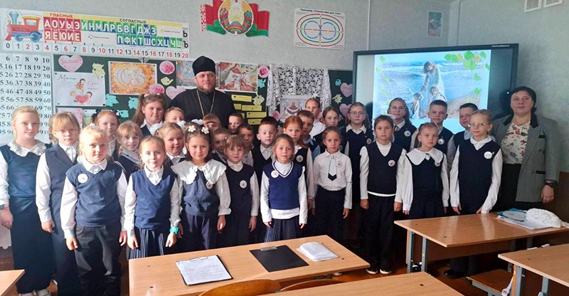 В рамках Недели родительской любви, которая в нашей стране проходит в период времени с 14 по 21 октября, в Клецкой средней школе №3 прошло открытое факультативное занятие по основам православной культуры на тему «Покров Пресвятой Богородицы». На встречу с ребятами пришел благочинный Клецкого церковного округа иерей Андрей Евшель – настоятель прихода храма Воскресения Христова г.Клецка.