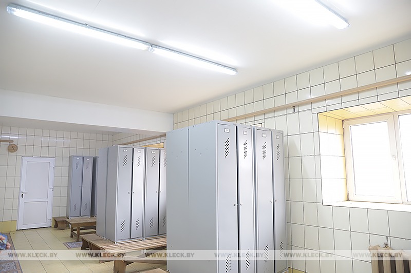 Ход работ заметен сразу. Строители уже заменили окна, начали преображать фойе, обновили потолки и установили новые шкафы в раздевалке мужского отделения.