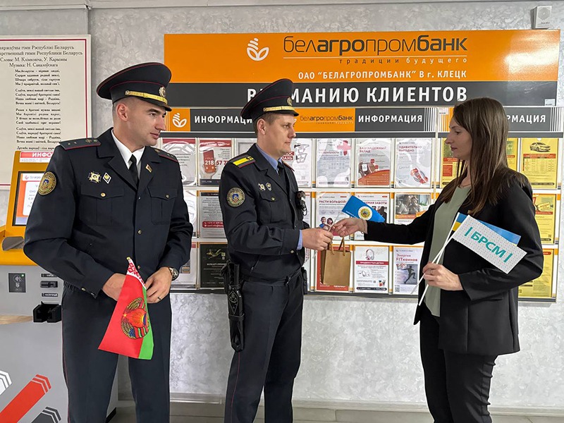 В преддверии профессионального праздника 29 октября – Дня образования службы охраны совместно с первым секретарем Клецкого РК ОО «БРСМ» Кононович В.А. и Клецким отделением Департамента охраны МВД прапорщиком милиции Иванейчик А.Н. была организована акция “НА СТРАЖЕ БЕЗОПАСНОСТИ И ПРОФЕССИОНАЛИЗМА”. Сотрудникам Клецкого отделения вручили сувениры и памятные подарки, а новым сотрудникам были вручены СМАРТ-БИЛЕТЫ БРСМ.