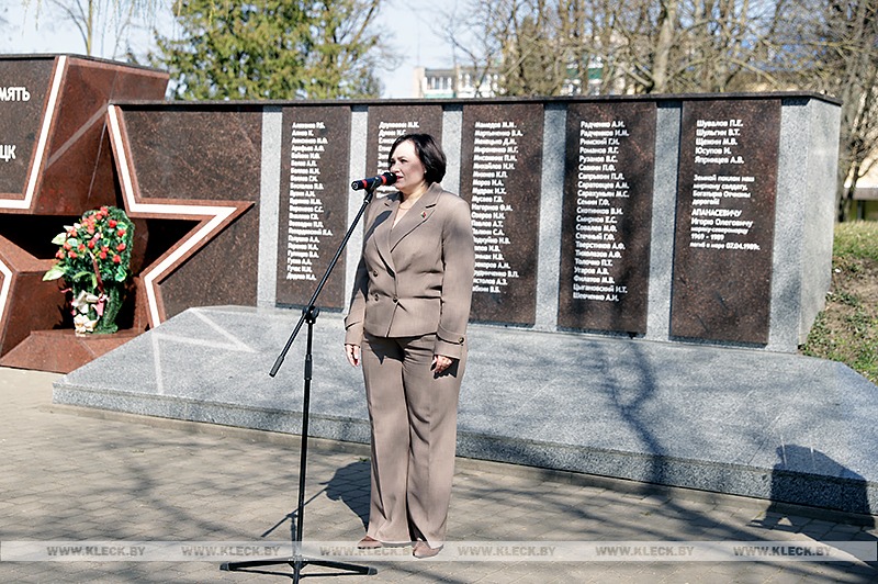 У мемориала советским воинам в Клецке делегации районов, солдат и членов патриотических клубов приветствовала председатель Клецкого районного Совета депутатов Наталья Суховей: